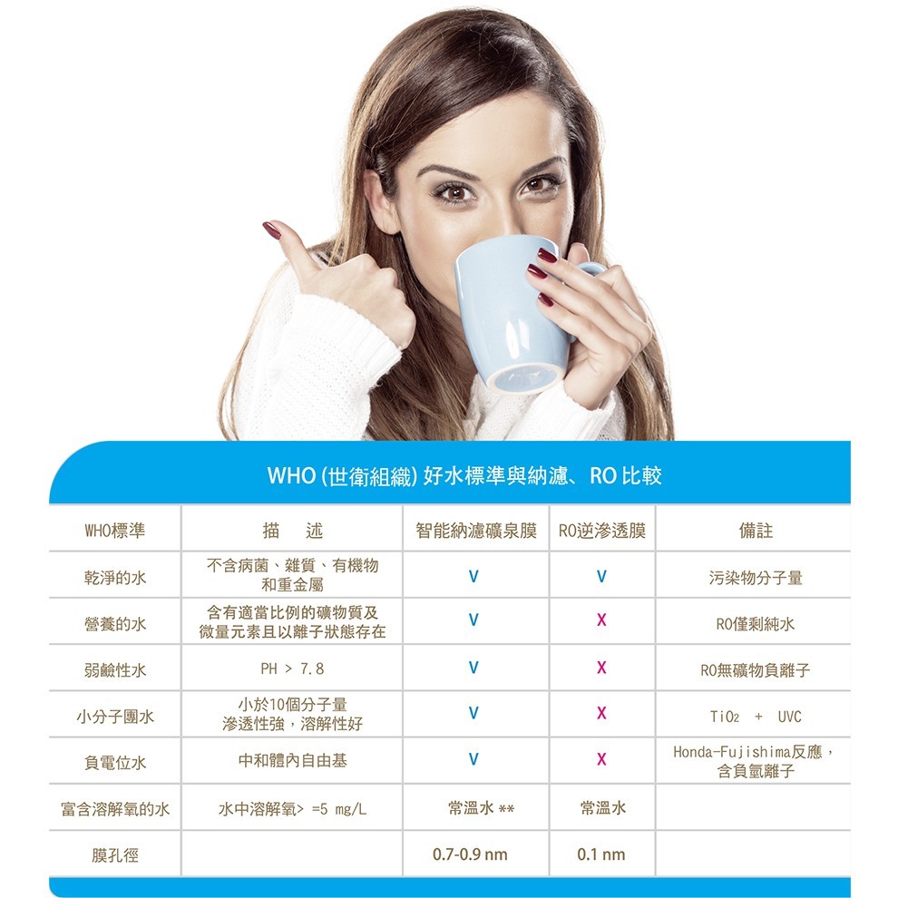 3. 健康:富含鈣鎂鉀鈉負離子的鹼性水,鈣鎂鉀鈉是保持身體健康的必需礦物質,普遍存在大自然的水中,納濾膜將水中所有污染物質截留的同時,更保留了前述礦物質;RO逆滲透膜則是將純水分子以外的身體必需礦物質也截留,水質呈酸性,對身體健康不利,不宜長期飲用。