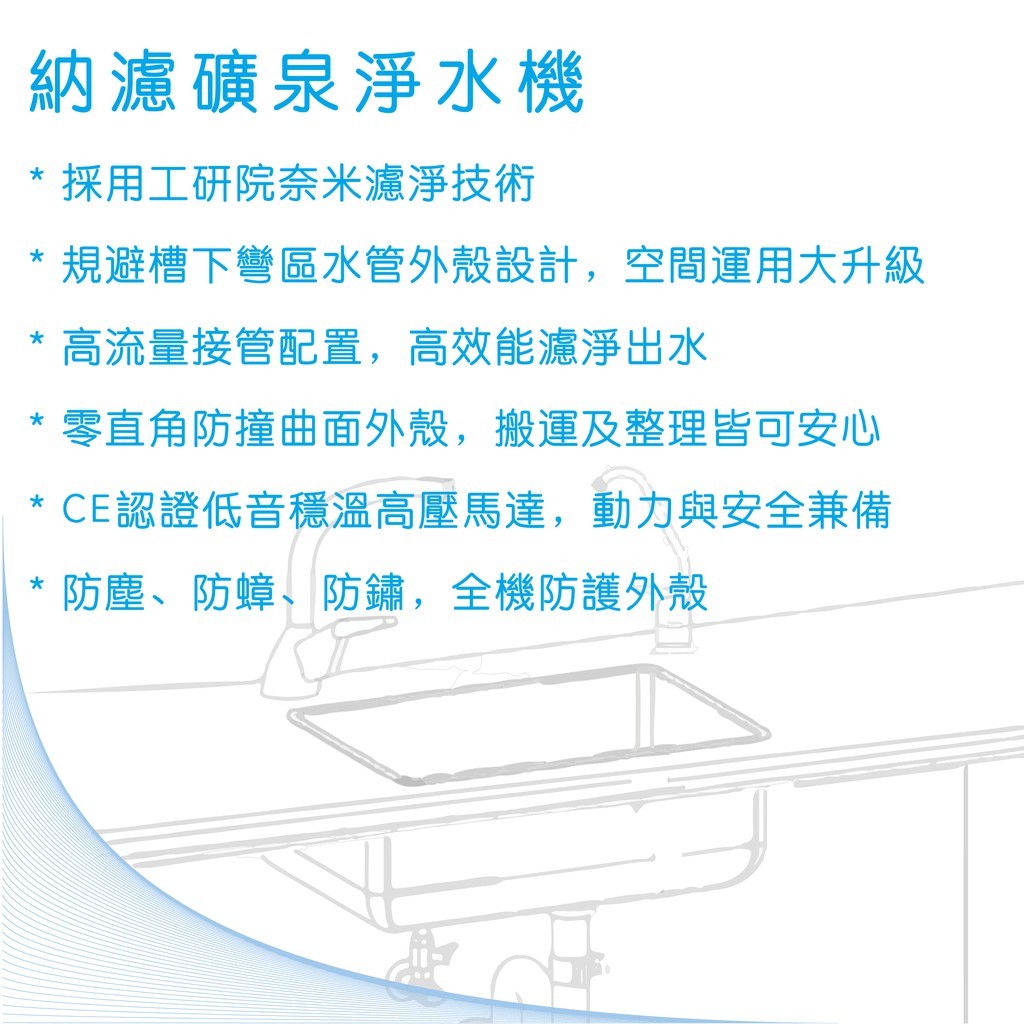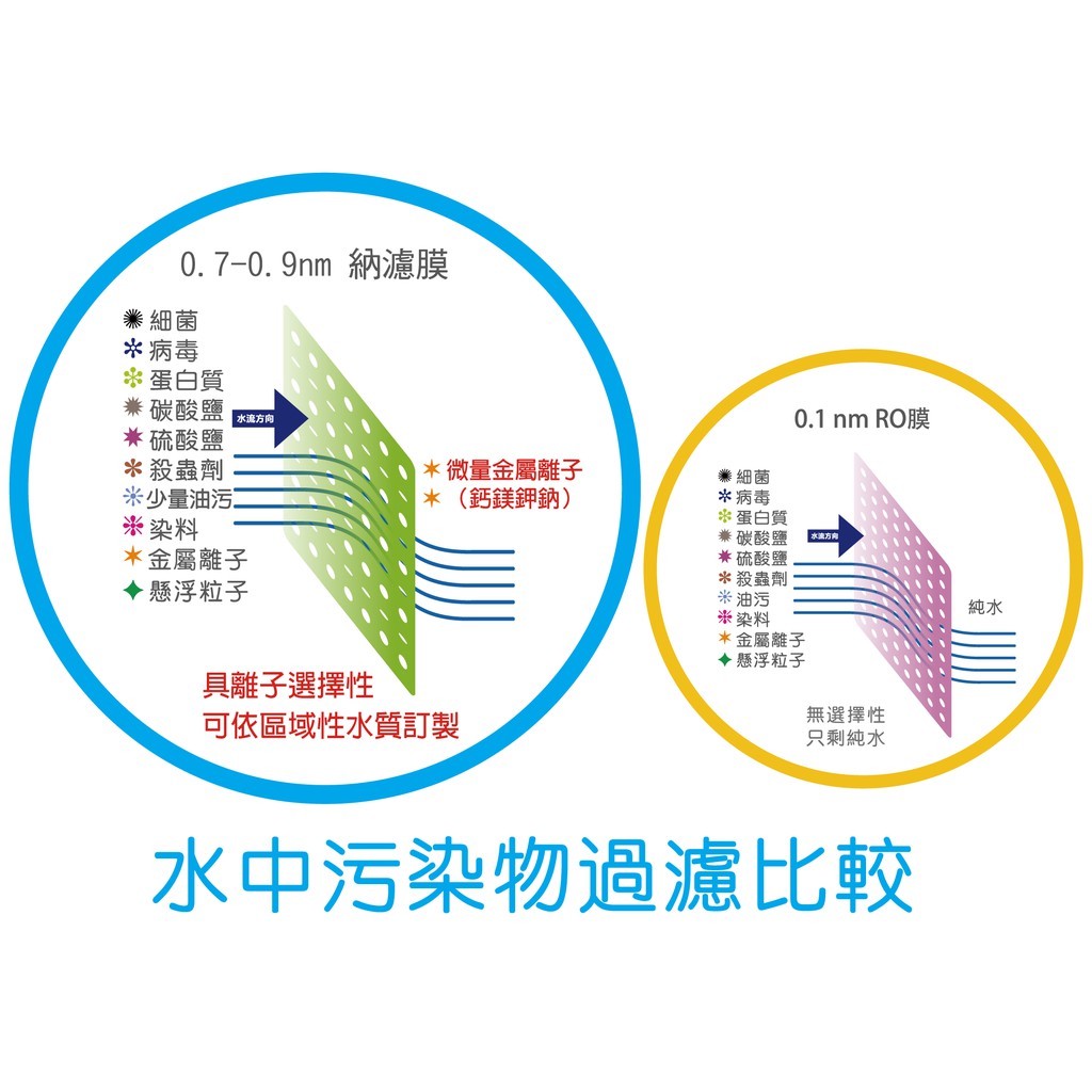 1.有別於一般傳統式淨水器採用的逆滲透、超濾,我們一律使用由工研院研發團隊所研發的新技術納濾膜,孔徑介於RO與超濾之間以分子量截留方式留住水中人體所需之礦物質,此技術於