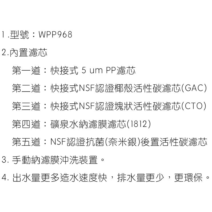 2. 節水 省電:納濾膜淨水器的淨水與廢水比例為1:0.8,相較於市面上RO逆滲透淨水器的 1:3,節水省電3.75倍。